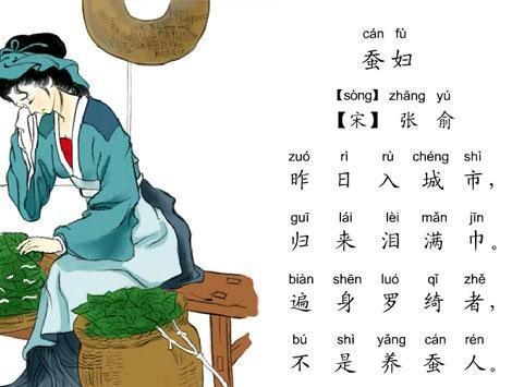 作品简介《蚕妇》是宋代诗人张俞的一首反映人民生活苦难的五言绝句。这首诗是通过以养蚕为业的农妇入城里卖丝的所见所感,揭示了怵目惊心的社会现实“剥削者不劳而获,劳动者无衣无食”的形象,表现了诗人对劳动人民的同情,对统治阶级的压迫剥削的不满。