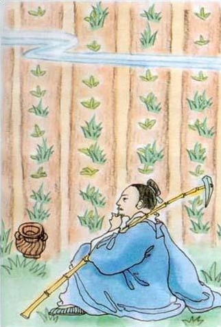 “种苗在东皋,苗生满阡陌。”这两句叙事,显得很随意,是说在东皋种苗,长势如何如何。但就在随意的话语中,显出了一种满意的心情,他说这话好像是在欣赏自己的劳动成果。“虽有荷锄倦,浊酒聊自适。”陶诗中有“带月荷锄归”,“浊酒”云云是常见的语句。看来他对“荷锄”并不感到是多大的重负,差不多习惯了。“日暮巾柴车,路暗光已夕。”《归去来兮辞》有“或巾柴车”的句子。这两句写得很自然,“日出而作,日入而息”,农家的生活本来就是如此自然。“归人望烟火,稚子候檐隙。”《归去来兮辞》有“稚子候门”的话。等着他的就是那么一个温暖的“归宿”,此时他的倦意会在无形中消释了。这四句写暮归,真是生动如画,画面浮动着一层安恬的、醉人的气氛。这就是陶渊明“田居”的一天,这一天过得如此充实、惬意。