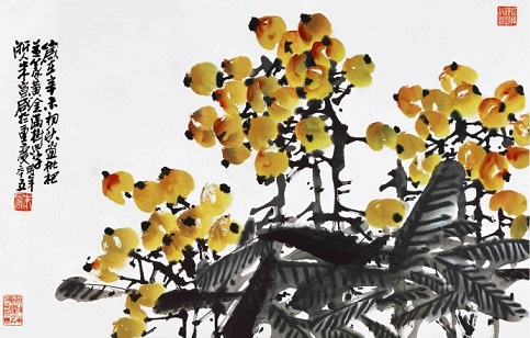 一个“醉”字不仅状写果农欢饮至醉的情态,更折射出人们幸福快乐的心情。他们热爱生活,热爱家乡,他们勤劳能干,经营自己的生活,有滋有味,有声有色。焉能不醉?同时从读者、诗人这个角度来看,这个“醉”字,其实也流露出诗人、读者深深地被果园的气氛所感染,满心欢喜、无比幸福的感觉。“一树金”这种表达属于超常搭配,本来是一树枇杷,颗颗饱满,金黄灿烂,耀眼生辉,令人垂涎,诗人形象描绘为“一树金”,给人的感觉就是一树金子,一树丰收,一树欢悦。快乐洒在枇杷树上,欢笑回荡在果园上空,果农们欢天喜地,心花怒放啊!他们用最朴素的方式来表达自己的满足和幸福。