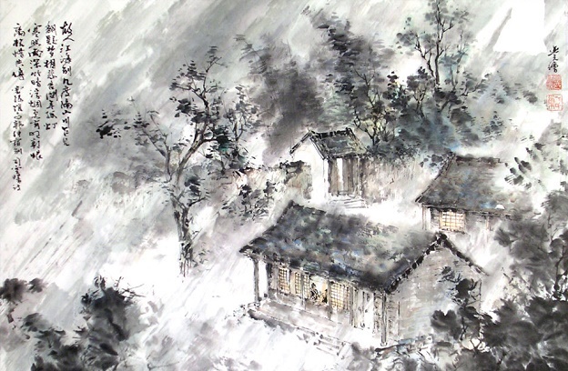 孤灯暗淡照着窗外冷雨,幽深的竹林漂浮着云烟。