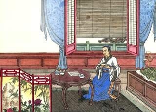 展现在读者眼前的,是一间华丽精致的卧室。镜头由室外逐渐移向室内,透过门前的阑干、当门的帘幕、门内的屏风等一道道障碍,聚影在那张铺着龙须草席和织锦被褥的八尺大床上。房间结构安排所显示出的这种“深而曲”的层次,分明告诉读者这是一位贵家少妇的金闺绣户。