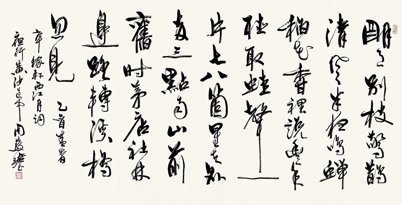 辛弃疾的这首词前两句“明月别枝惊鹊,清风半夜鸣蝉”表面看来,写的是风、月、蝉、鹊这些极其平常的景物,然而经过作者巧妙的组合,结果平常中就显得不平常了。鹊儿的惊飞不定,不是盘旋在一般树头,而是飞绕在横斜突兀的枝干之上。因为月光明亮,所以鹊儿被惊醒了;而鹊儿惊飞,自然也就会引起“别枝”摇曳。同时,知了的鸣叫声也是有其一定时间的。夜间的鸣叫声不同于烈日炎炎下的嘶鸣,而当凉风徐徐吹拂时,往往特别感到清幽。总之,“惊鹊”和“鸣蝉”两句动中寓静,把半夜“清风”“明月”下的景色描绘得令人悠然神往。