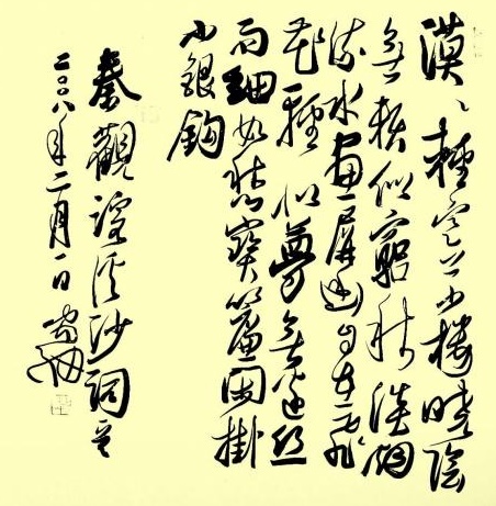 漠漠轻寒上小楼,晓阴无赖似穷秋。淡烟流水画屏幽。出自北宋秦观词作《浣溪沙·漠漠轻寒上小楼》,曾被誉为《淮海词》中小令的压卷之作,描绘一个女子在春阴的怀抱里所生发的淡淡哀愁和轻轻寂寞。上阕写阴冷的春天早晨,独上小楼,空房内画屏竖立,显得格外清幽。下阕所写眼前景物,待慢慢挂起窗帘,观落花轻飘,细雨蒙蒙,触目伤情。作者用“轻描淡写”的笔法,融情入景,明写景,实写人的愁怨,其构思之精巧,意境之优美,犹如一件精致小巧的艺术品。全词意境怅静悠闲,色调轻浅幽渺,含蓄有味。