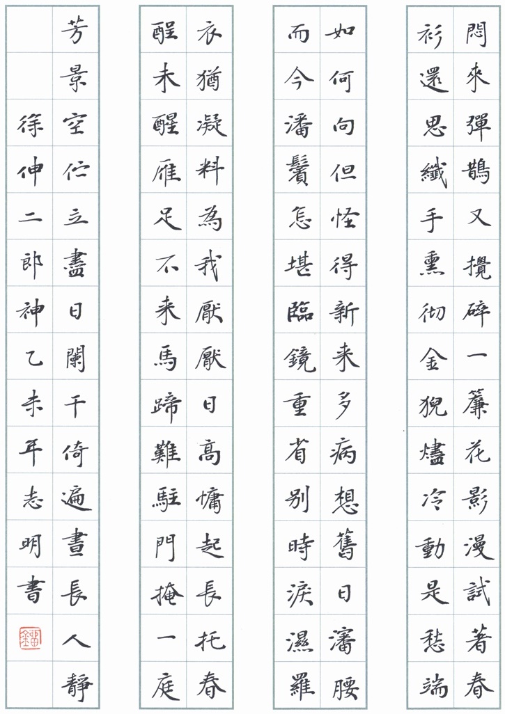 重省。别时泪湿,罗衣犹凝。料为我厌厌,日高慵起,长托春酲未醒。雁足不来,马蹄难驻,门掩一庭芳景。空伫立,尽日阑干倚遍,昼长人静。