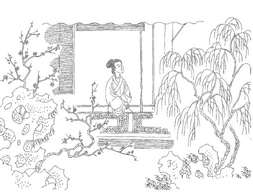 浓密的柳阴遮住了黄鹂的倩影,也听不到它的歌唱。蝴蝶翻飞于鲜花上,不知是庄周还是蝴蝶令人迷惘。我知道自己的两鬓已白,就像当年的潘郎。我没有用罗衫遮掩面庞,只是把眼泪偷偷掩藏。回忆往事,飞逝的时光令我畏惧。早春再回人间,我偷偷地看一看那落着细雨的池塘,不由得暗自神伤,只见一朵梅花正绽开一半,含情脉脉,宛如徐妃的半面粉妆。