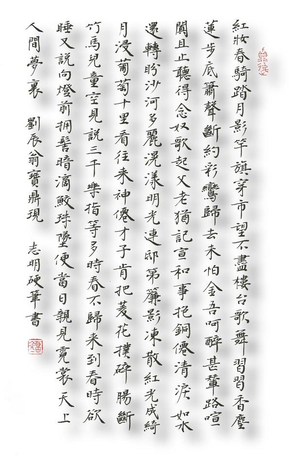 方圆十里的金波形成一道奇丽景色,在湖船长堤上,士女如云,则构成另一种繁华景观。灯红酒绿之中,那些“神仙才子”,有没有人象南朝徐德言那样预料到将有国破家亡之祸,而预先将菱花镜打破,与妻子各执一半,以作他日团圆的凭证。“肯把菱花扑碎”一句,寓有词人刻骨铭心的亡国之痛,故在三阕一开始就是“肠断竹马儿童,空见说、三千乐指”,总收前面两段,发往事如烟,江山不再的感慨。入元以后,前朝遗老固然知道前朝故事(比如“三千乐指”这样的典故),而骑竹马的儿童,则只能从老人口中略知一二,可惜已无缘得见了。季节轮回依旧,人们依旧盼着春天,盼着元夕,但蒙古统治下,使元夕,不免萧条。