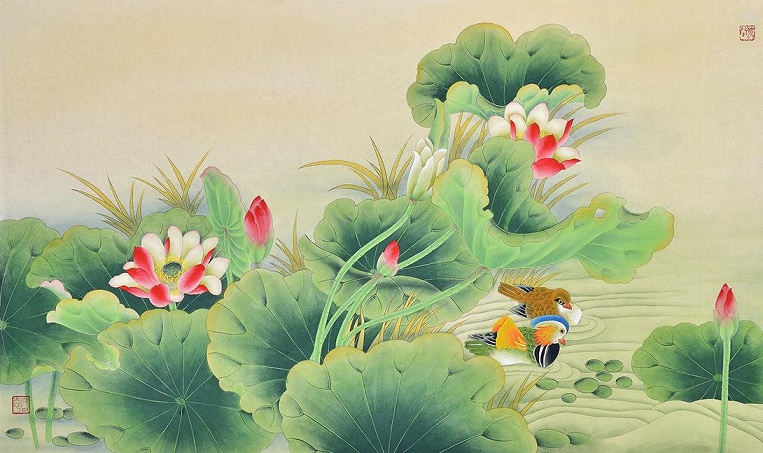 碧绿圆叶多么雅洁,在浅浅汀洲、远远水浦,你亭亭卓立,清超至极。身边坠几点花片,犹如美人遗落的钗钿。你不肯舒展肃爽的心,又能把多少炎热卷起?有你绿色车盖的荫庇,看那双鸳鸯谈得何其亲密。不要对洗纱女说这番情景,花风忽地吹断她的怨歌,我怕她会折碎荷叶,如散千叠翠云。