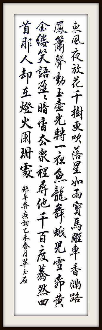 从词调来讲,《青玉案》十分别致,它原是双调,上下片相同,只上片第二句变成三字一断的叠句,跌宕生姿。下片则无此断叠,一连三个七字排句,可排比,可变幻,总随词人之意,但排句之势是一气呵成的,单单等到排比完了,才逼出煞拍的警策句。北宋另有贺铸一首(《青玉案·凌波不过横塘路》),此义正可参看。