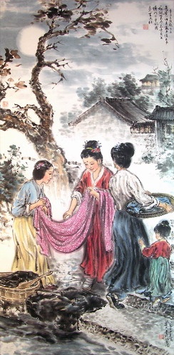 1、捣衣:将洗过的衣服放在砧石上,用木杵捣去碱质。这里指人们准备寒衣。