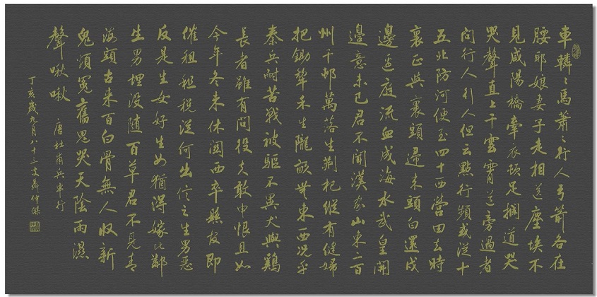 《兵车行》是杜诗名篇,为历代所推崇。它揭露了唐玄宗长期以来的穷兵黩武,连年征战,给人民造成了巨大的灾难,具有深刻的思想内容。在艺术上也很突出。首先是寓情于叙事之中。这篇叙事诗,无论是前一段的描写叙述,还是后一段的代人叙言,诗人激切奔越、浓郁深沉的思想感情,都自然地融汇在全诗的始终,诗人那种焦虑不安、忧心如焚的形象也仿佛展现在读者面前。其次在叙述次序上参差错落前后呼应,舒得开,收得起,变化开阖,井然有序。第一段的人哭马嘶、尘烟滚滚的喧嚣气氛,给第二段的倾诉苦衷作了渲染铺垫;而第二段的长篇叙言,则进一步深化了第一段场面描写的思想内容,前后辉映,互相补充。同时,情节的发展与句型、音韵的变换紧密结合,随着叙述,句型、韵脚不断变化,三、五、七言,错杂运用,加强了诗歌的表现力。如开头两个三字句,急促短迫,扣人心弦。后来在大段的七字句中,忽然穿插上八个五字句,表现“行人”那种压抑不住的愤怒哀怨的激情,格外传神。用韵上,全诗八个韵,四平四仄,平仄相间,抑扬起伏,声情并茂。再次,是在叙述中运用过渡句和习用词语,如在大段代人叙言中,穿插“道旁过者问行人,行人但云点行频。”“长者虽有问,役夫敢申恨?”和“君不见”、“君不闻”等语,不仅避免了冗长平板,还不断提示读者,造成了回肠荡气的艺术效果。诗人还采用了民歌的接字法,顶真勾连,如“牵衣顿足拦道哭,哭声直上干云霄”,“道旁过者问行人,行人但云点行频”等,这样蝉联而下,累累如贯珠,朗读起来,铿锵和谐,优美动听。最后,采用了通俗口语,如“耶娘妻子”、“牵衣顿足拦道哭”、“被驱不异犬与鸡”等,清新自然,明白如话,是杜诗中运用口语非常突出的一篇。前人评及此,曾这样说:“语杂歌谣,最易感人,愈浅愈切。”这些民歌手法的运用,给诗歌增添了明快而亲切的感染力。
