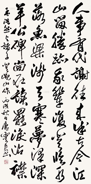 颔联紧承首联。“江山留胜迹”是承“古”字,“我辈复登临”是承“今”字。“胜迹”,是指山上的羊公碑和山下的鱼梁洲等。作者的伤感情绪,便是来自今日的登临。登临岘山,首先看到的就是羊祜庙和堕泪碑。羊祜镇守襄阳颇有政绩,深得民心,他死后,襄阳人民怀念他,在岘山立庙树碑,“望其碑者莫不流泪,杜预因名为‘堕泪碑’。”诗人望碑而感慨万分,想到了前人的留芳千古,也想到了自己的默默无闻,不免黯然伤情。