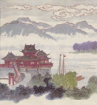 二是气象恢宏、色彩缤纷的绘画美。诗中有画,历来被认为是山水写景诗的一种艺术标准,《黄鹤楼》也达到了这个高妙的境界。首联在融入仙人乘鹤的传说中,描绘了黄鹤楼的近景,隐含着此楼枕山临江,峥嵘缥缈之形势。颔联在感叹“黄鹤一去不复返”的抒情中,描绘了黄鹤楼的远景,表现了此楼耸入天际、白云缭绕的壮观。颈联游目骋怀,直接勾勒出黄鹤楼外江上明朗的日景。尾联徘徊低吟,间接呈现出黄鹤楼下江上朦胧的晚景。诗篇所展现的整幅画面上,交替出现的有黄鹤楼的近景、远景、日景、晚景,变化奇妙,气象恢宏;相互映衬的则有仙人黄鹤、名楼胜地、蓝天白云、晴川沙洲、绿树芳草、落日暮江,形象鲜明,色彩缤纷。全诗在诗情之中充满了画意,富于绘画美。