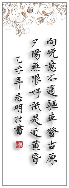 此诗前两句“向晚意不适,驱车登古原”点明登古原的时间和原因。“向晚”指天色快黑了,“不适”指不悦。诗人心情忧郁,为了解闷,就驾着车子外出眺望风景,于是登上古原,即乐游原。自古诗人词客,善感多思,而每当登高望远,送目临风,更易引动无穷的思绪:家国之悲,身世之感,古今之情,人天之思,往往错综交织,所怅万千,殆难名状。陈子昂一经登上幽州古台,便发出了“念天地之悠悠”的感叹,恐怕是最有代表性的例子了。李商隐这次驱车登古原,却不是为了去寻求感慨,而是为了排遣他此际的“向晚意不适”的情怀。