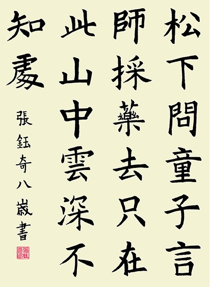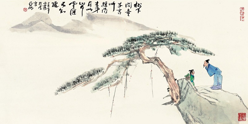 苍松下,我询问了年少的学童;他说,师傅已经采药去了山中。他还对我说,就在这座大山里,可山中云雾缭绕,不知他行踪。