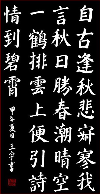 “自古逢秋悲寂寥”,诗人开篇,即以议论起笔,断然否定了前人悲秋的观念,表现出一种激越向上的诗情。首句即明确指出自古以来,人们每逢到了秋天就感叹秋天的寂寞萧索。“自古”和“逢”,极言悲秋的传统看法的时代久远和思路模式的顽固。接着一句用“我言”直抒胸臆,态度鲜明,说出的是诗人的自信,这种自信,尽管染上的,是一种不幸的色彩,然而,诗人阔大的胸襟却非凡地溶解了这种不幸。“秋日胜春朝”,用对比手法,热情赞美秋天,说秋天比那万物萌生,欣欣向荣的春天更胜过一筹,这是对自古以来那种悲秋的论调的有力否定。