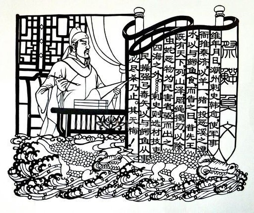 某年某月某日,潮州刺史韩愈派遣部下军事衙推秦济,把羊一头、猪一头,投入恶溪的潭水中,送给鳄鱼吃,同时又警告它:古时候的帝王拥 有天下后,放火焚烧山岭和泽地的草木,用绳索去网捉、用利刃去刺杀,以除灭虫、蛇等那些给人民带来危害的可恶动物,并把它们驱逐到四海之外去。到了后世, 帝王的德行威望不够,不能统治远方,于是,长江、汉水之间的大片土地只得放弃给东南各族;更何况潮州地处五岭和南海之间,离京城有万里之遥呢!鳄鱼之所以 潜伏、生息在此地,也就很自然了。