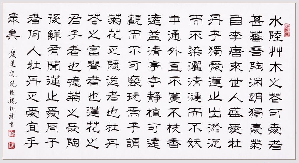 水陆草木之花,可爱者甚蕃。晋陶渊明独爱菊。自李唐来,世人甚爱牡丹。予独爱莲之出淤泥而不染,濯清涟而不妖,中通外直,不蔓不枝,香远益清,亭亭净植,可远观而不可亵玩焉。(甚爱 一作:盛爱)